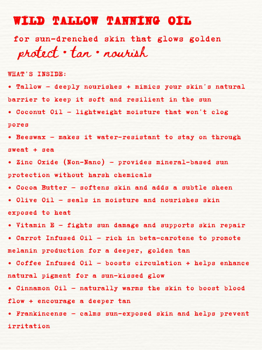 Organic Grass Fed Tallow – Organic Coconut Oil – Pure Beeswax –Pure Zinc Oxide (Non-Nano) – Organic Cocoa Butter – Extra Virgin Olive Oil – Organic Vitamin E – Organic Carrot Infused Oil –Organic Coffee Infused Oil – Organic Cinnamon Oil – Organic Frankincense